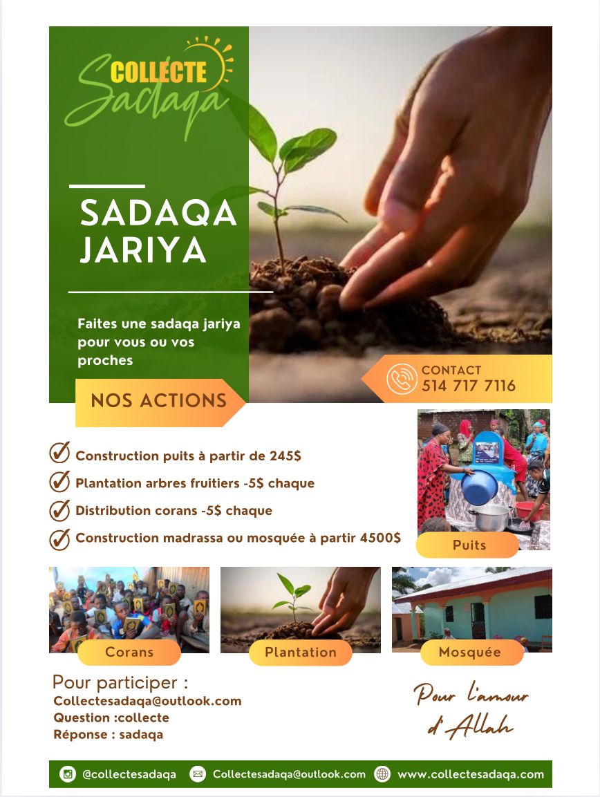 Dans un mois environ nous accueillons le mois bénie de ramadan, nous avons l’opportunité de participer à des œuvres durables qui continueront à apporter des bénédictions au-delà de nos vies. Nous lançons comme chaque année une collecte spéciale pour un Pack 4 Sadaqa Jariya qui englobera :